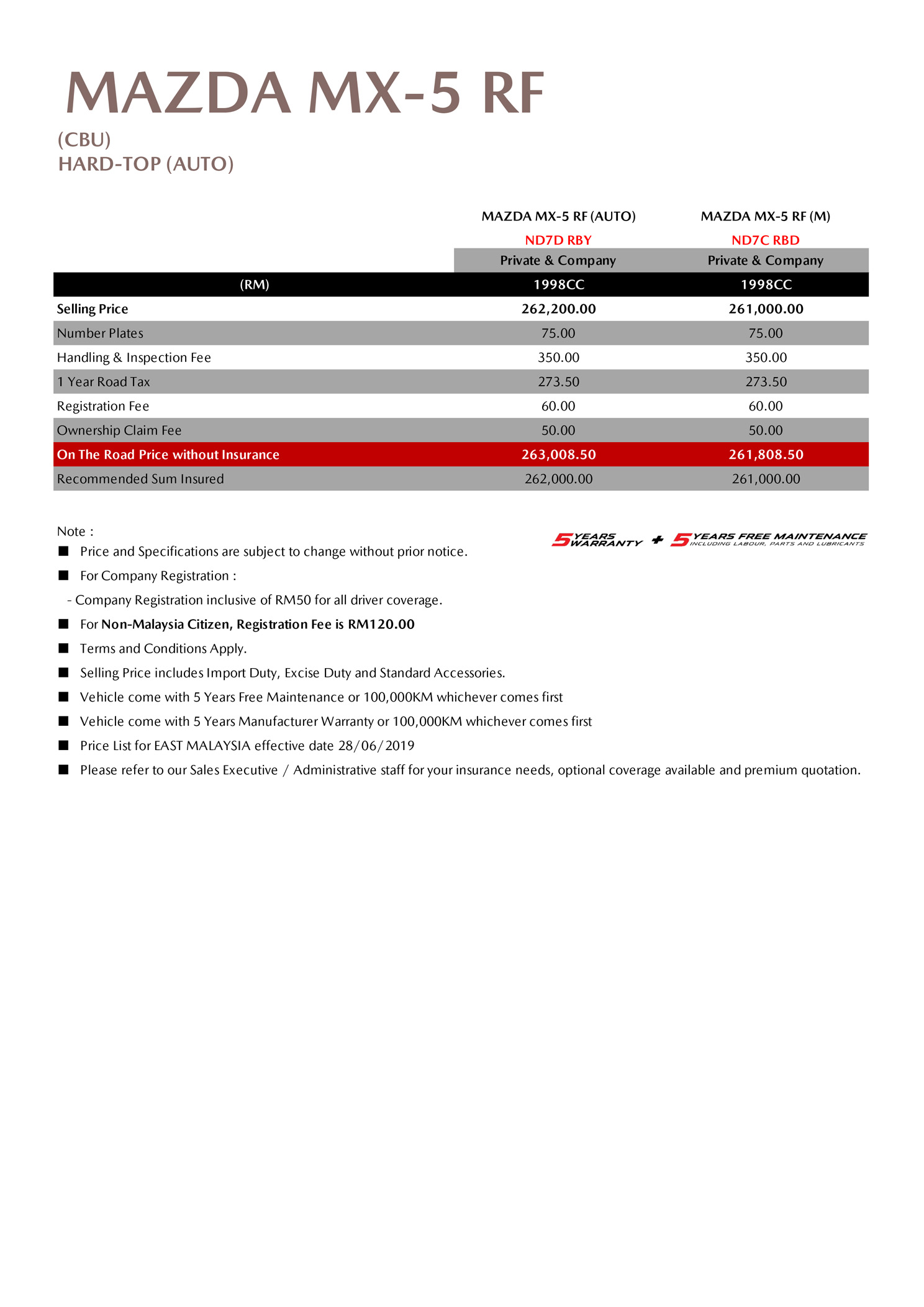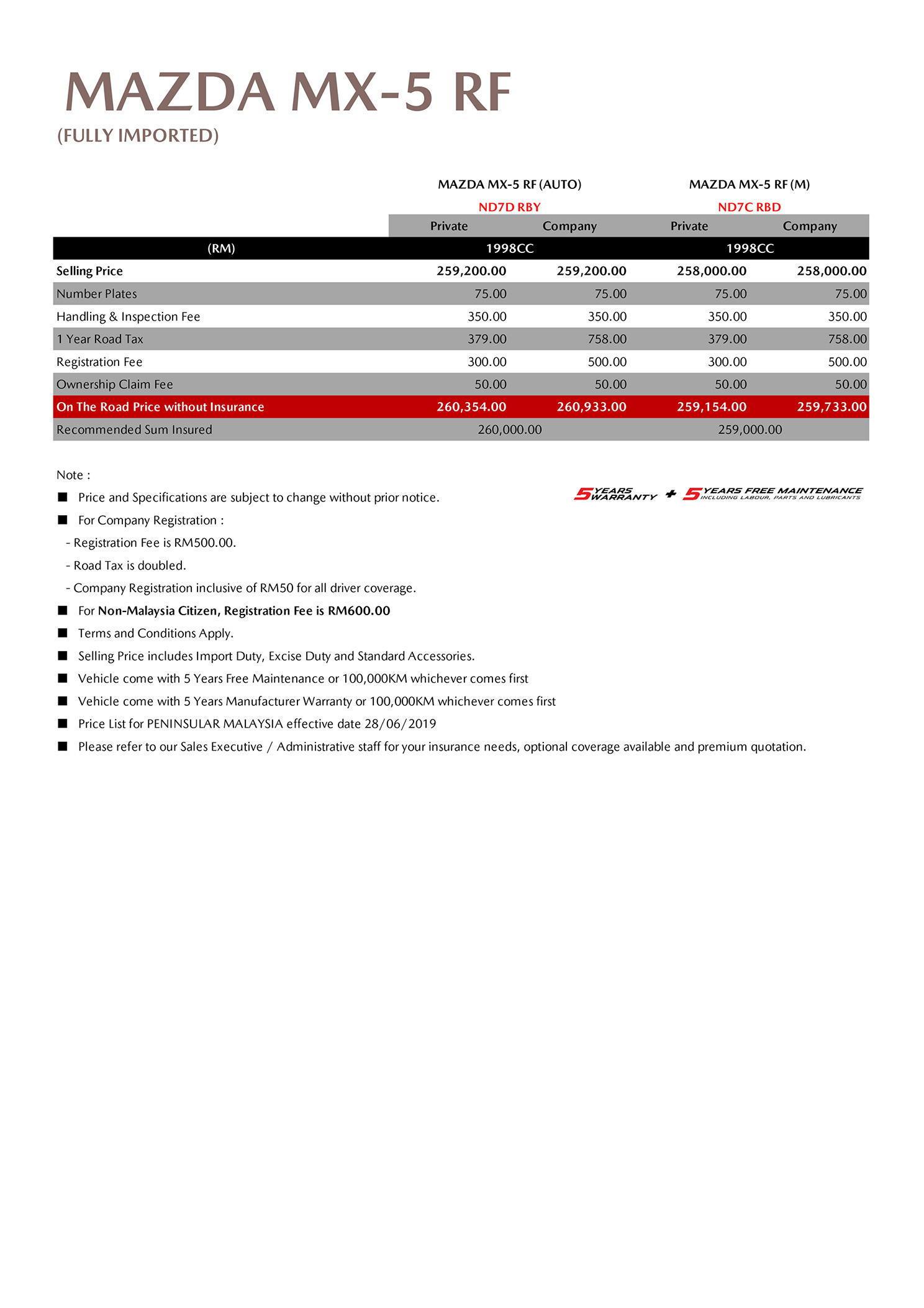 *5 years free scheduled maintenance, or first 100,000km whichever comes first.