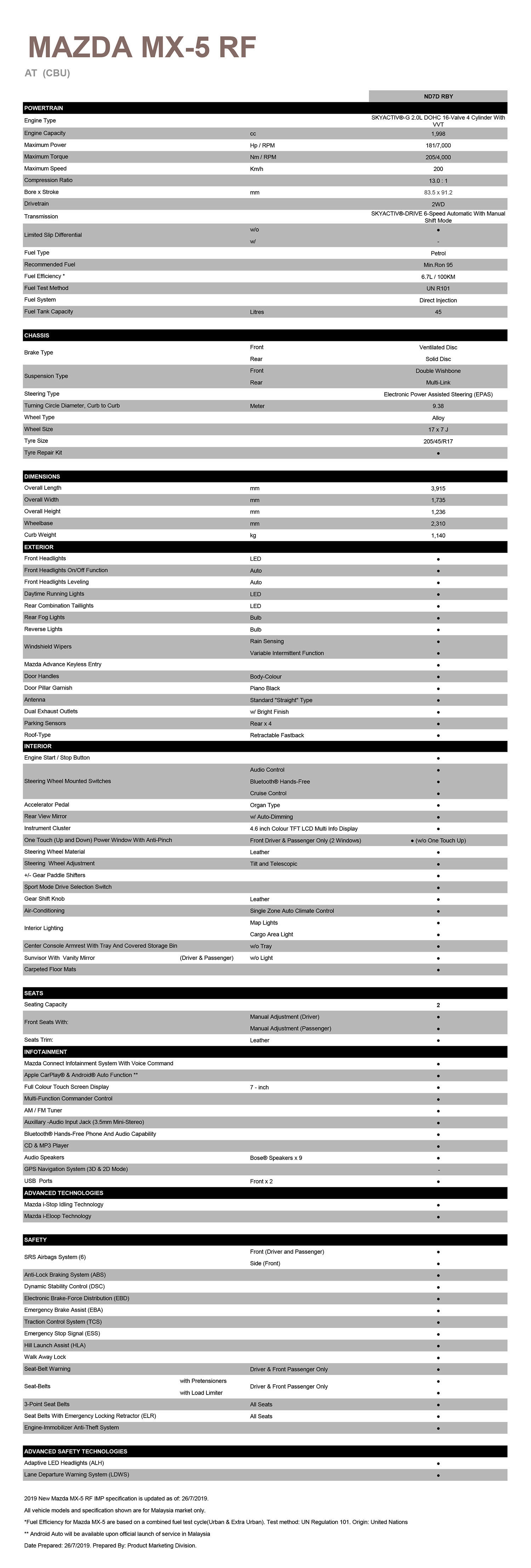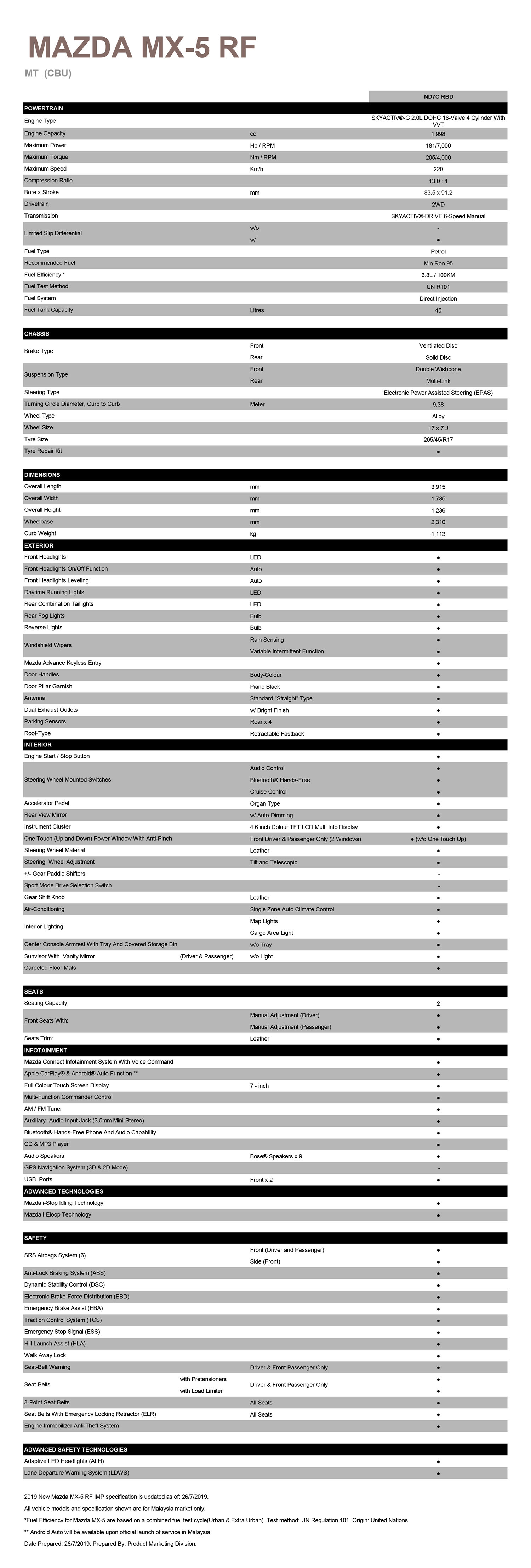 Featuring our award-winning SKYACTIV Technology, this exciting sports car offers the perfect combination of fuel economy and thrilling rear-wheel driving fun, whilst also offers high levels of innovative technology and advanced in-car connectivity. Inspired by the Japanese notion of Jinba Ittai - ‘horse and rider as one’, this intimate bond between car and driver is what makes the Mazda MX-5 RF feel responsive, exhilarating and fun to drive.